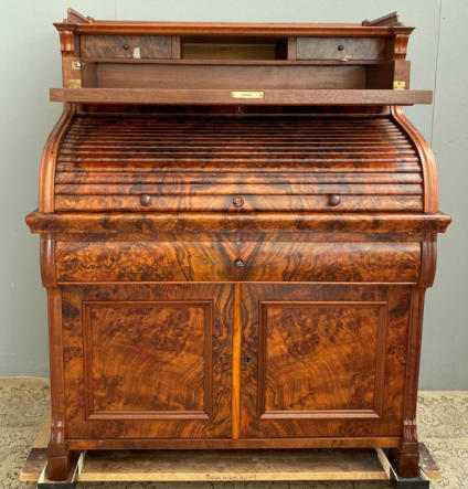 in der Mitte ein Rollverschluss mit auziehbarer Schreibplatte, dahinter vier kleine Schubladen, eine Tür,