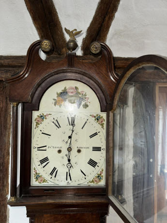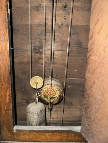 bemaltes Eisen-Ziffernblatt mit Dudelsack und Blumen-Trauben, Pendel mit Blumenmuster