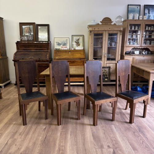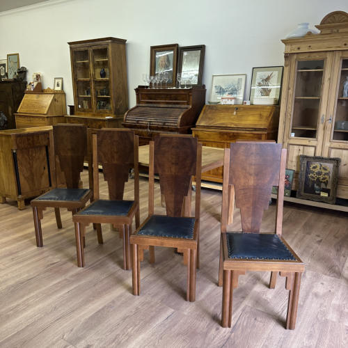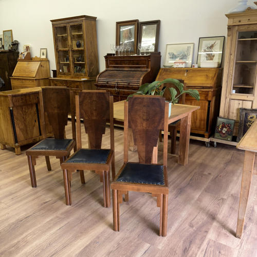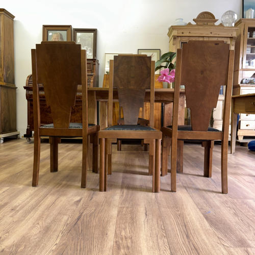 antike Art Deco Polster-Stühle, Nussbaum und Buche, um 1930, vier identische,